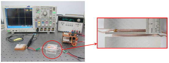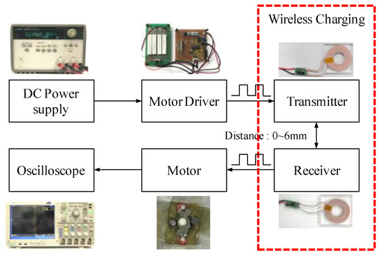 The single-phase switched reluctance motor was easier to apply to a wireless-driven circuit than typical three-phase motors. The motor driver was combined with a commercial wireless charging module to produce square wave signals transmitted wirelessly to the single-phase switched reluctance motor. The experiment used the XKT-412 wireless transmission module and XKT335 wireless charging IC produced by Shenzhen Core Ketai Electronics Co., Ltd. (Shenzhen, China). The operating voltage of the wireless charging module was 5 V to 12 V with a frequency of 0 to 2 MHz. It can produce a maximum current of 1 A with a transmission distance of 0 mm to 10 mm. The schematic diagram of the wireless-driven, axial-flux, single-phase switched reluctance motor is shown in Figure 20, and a photograph of the actual set-up is shown in Figure 21.