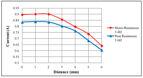 As the output characteristics of the wireless-driven circuit are greatly affected by changes in output load and distance, this study first tested the relationship between the output current and distance. In order to avoid the motor inductance effect, the experiment compared the results with two test loads: 3.4 Ω for the motor and a pure resistance of 3.6 Ω. In the experiment, the power supply was set to a voltage of 5 V and current of 1 A, and the measurements of the wireless-receiving end were taken at a distance of every 1 mm from 0 mm to 6 mm. The currents of the motor and pure resistance loads reached their maximum values of 0.9 A and 0.84 A, respectively, and fell quickly over a 2 mm distance. Figure 22 shows the current-distance curves of the single-phase switched reluctance motor and pure resistance loads.