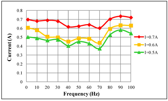 The purpose of this experiment was to examine the excitation frequency effect on the output current of the wireless charging module. To avoid the influence of the motor inductance, the experiment was conducted with a pure resistance load of 3.6 Ω at a 2 mm distance. The output currents were set at 0.5 A, 0.6 A, and 0.7 A at 1.25 Hz, and the measurements were taken with an excitation frequency at every 10 Hz between 1.25 Hz and 100 Hz. The test results showed that an increase in frequency led to a gradual decrease of current for increases in frequency up to 70 Hz, after which the current gradually increased with further increases in the frequency. At 90 Hz, the current was at its maximum. Figure 23 shows the current-frequency curves of the wireless charging module.