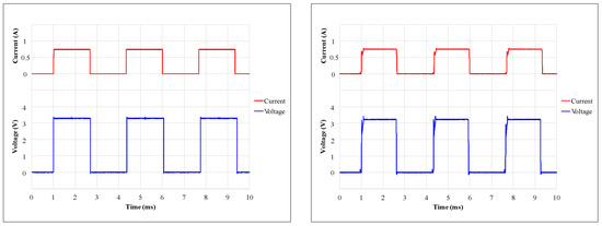 Voltage and current signals of the motor at 900 rpm with wire-driven (left) and wireless-driven (right) conditions.