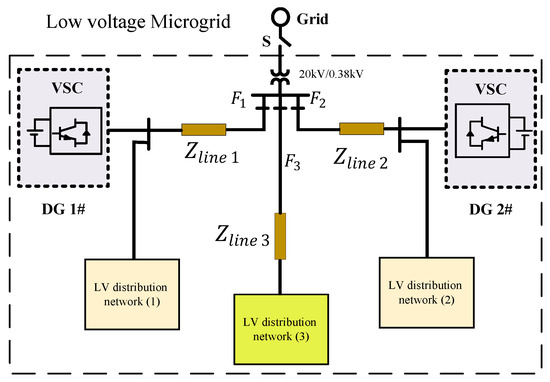 Figure 1 shows a single-line diagram of a multi-bus LV microgrid that consists of three LV feeders and two electronically-coupled three-phase four-wire DG units. Loads in the three radial feeders can be either balanced or unbalanced. The DG units connected via feeders and to the microgrid are assumed to be dispatchable. Therefore, they can provide any amount of real/reactive power within their pre-specified limits. Each unit has to maintain its voltage and frequency in the pre-specified level, while an accurate power-sharing is ensured through a decentralized method. The loads are connected to the microgrid through four wires. Therefore, the load current can have a zero-sequence current in addition to the negative-sequence current when loads in the microgrid are unbalanced. In this paper, it is assumed that microgrid works in islanded mode of operation. Therefore, the microgrid is responsible for compensating zero- and negative-sequence currents of unbalanced loads. If the islanded microgrid does not compensate these currents, the voltage will be distorted.