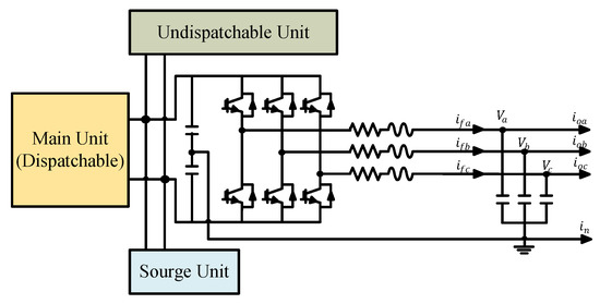 The voltage control unit and average power sharing unit in Figure 4 represent the primary and secondary controller of the microgrid, respectively, where active and reactive power are controlled by the droop controller, and frequency and voltage are controlled by the voltage control unit. The VZSIC and VNSIC controller represent the auxiliary control units, which are responsible for controlling zero- and negative sequence current in the microgrid. The reference current is defined by the strategy stated in the Results section. The reference (DC signal) is compared to the actual current where it is fed into the PI controller. The output current is multiplied to and respectively, to produce the reference for zero- and negative-sequence currents, respectively. The idea of the control system is to provide the reference voltage for any current that needs to be controlled. The droop controller produces the positive-sequence voltage reference, which is used to control positive sequence current (current is controlled, and then active and reactive power are controlled). The VZSIC and VNSIC produce the negative- and zero sequence voltage reference, which is used to control negative- and zero-sequence current.