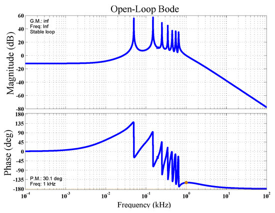 Because the matrix transfer function of the DG subsystem in equation (6) is diagonal, the three identical SISO controllers can be independently designed for the quadrature axes , and 0. Figure 4 shows the structure of the voltage and current controllers for the , and 0 axes. A good controller should be able to track the reference signal with a minimum transient and error while it should guarantee a low THD of voltage in the presence of harmonic loads. Since the controllers are designed in the stationary framework, reference signals are sinusoidal. Therefore, the multi-proportional-resonant controller (MPRC) is used. MPRC can track sinusoidal references with zero tracking error, while a conventional PI controller has magnitude and phase error and can not effectively track sinusoidal signals. Therefore, MPRC can handle harmonic loads without deteriorating voltage quality. By using MPRC as the current controller, the control structure can be used in the grid-connected mode of operation as well. Therefore, there is no need for a different control structure in grid-connected mode. As a result, the total cost for design and operation of microgrid decreases. Matlab SISO Tool software (version 2018a, MathWorks, Natick, Massachusetts, U.S.A) is used to design the controllers. It is a graphical tool used to design robust controllers. This tool gets the system plant of the controller, the structure of the controller and the topology of the system. i.e., open loop or closed loop. Through the graphical user interface, the user can design a controller has the desired parameters such as phase margin, gain margin, the locus of poles, damping ratio, and bandwidth. Since the input signal of the control system is sinusoidal, MPRC was selected as a control structure. Considering it multi-resonant, with high gain at desired frequencies, it can track the input signal and damp higher frequencies up to 13th harmonic. However, for this work, only the controller with 50 Hz resonant frequency (with a value of ) is important. The rest of the resonant controllers ( to ) are used to control the harmonics for future works.