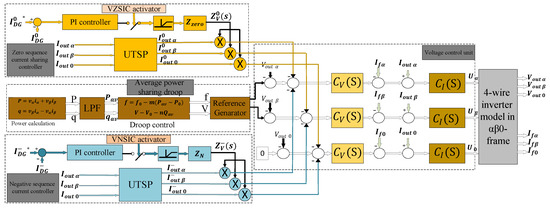 To control the zero- and negative-sequence currents, zero- and negative-sequence current controllers are used, respectively. In these blocks, the output current of each DG unit () is decomposed to its symmetrical component with a unified three-phase signal processor (UTSP) [41]. The UTSP block can accurately decompose the symmetrical parameters of current, so that the instantaneous amount of zero- and negative-sequence currents can be obtained from the output current.
