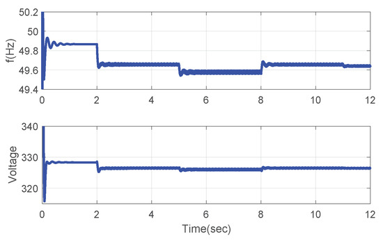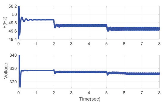 In this case study, initially, two balanced loads are connected to feeders and . The load that is connected to feeder is a three-phase load with the nominal power of 285 kVA and a power factor of = 0.88, while the load connected to feeder is a three-phase load with 75 kVA with = 0.9. A single-phase load rated 40 kVA with = 0.98 is connected to one phase of feeder at t = 2 s. Subsequent to this load change, at t = 5 s, another single-phase load rated 26 kVA with = 0.95 is connected to the same phase of feeder . Figure 8a shows the frequency of the system. The droop coefficient is set so that, on the no-load situation, the frequency stays at 50 Hz. With the use of conventional droop with a dynamic coefficient, the voltage and frequency reach stable mode after about 0.5 seconds of transient time. Figure 8b shows the voltage output at the DG1 terminal. After addition of unbalanced load to the loads, a double frequency ripple is added to frequency and voltage of the network. The frequency and voltage deviation is less than 1% and 5% for frequency and voltage, respectively, which demonstrate that the deviation is in the range of acceptable limit for frequency and voltage.