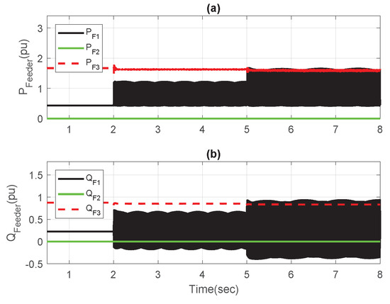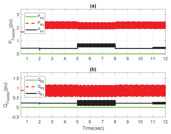 Unbalanced load changes in feeder (a) instantaneous real and (b) reactive power of feeders.