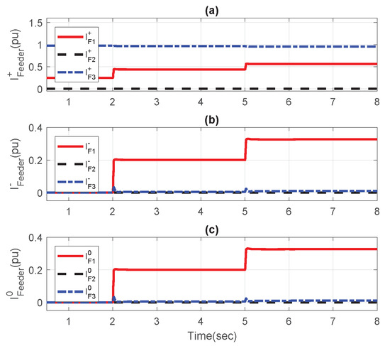 Figure 10 shows the positive-, negative- and zero-sequence current components of feeder that increases at t = 2 s and t = 5 s.