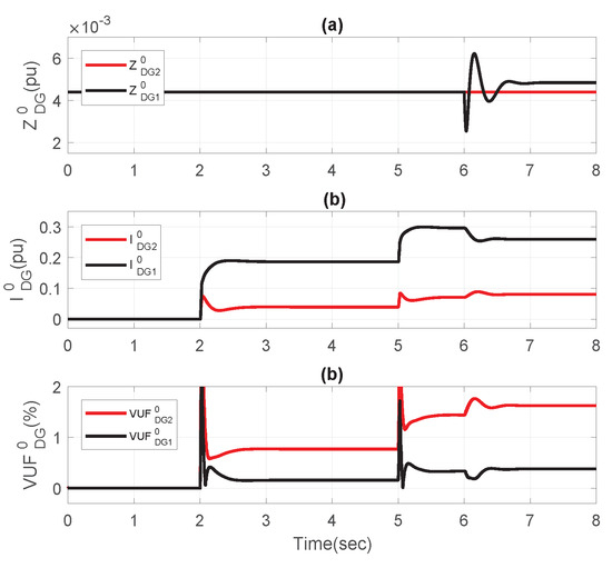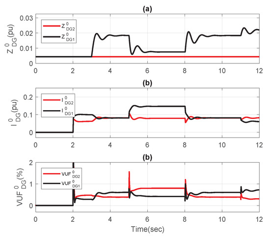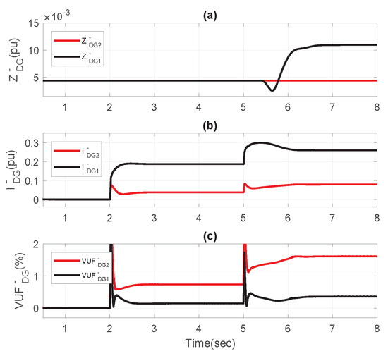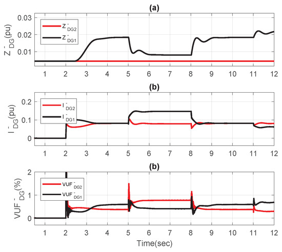 Figure 12a,b show the negative-sequence output impedance and the negative-sequence currents of the DGs, respectively. The same scenario happens for negative-sequence current when the maximum capacity of unit 1 for providing negative-sequence current is reached, and the remaining negative-sequence current is shared by another unit through the activation of VNSIC. Figure 11c and Figure 12c show, respectively, the voltage unbalanced factor () for the zero- and negative-sequence voltage of DG units during load changes. The of is always under 2% for zero- and negative-sequences while DG1 is injecting the maximum value of zero- and negative-sequence currents.