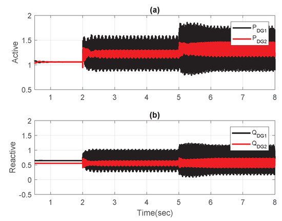 The first step toward controlling power component effectively is controlling Active and reactive powers. If these components are not controlled accurately, it will not be possible to share other power components effectively. Figure 11a,b show the zero-sequence output impedances and the zero-sequence currents of the DGs, respectively. As it was mentioned earlier, the primary aim of the unbalanced current sharing strategy is to compensate zero- and negative-sequence currents locally. However, if the maximum capacity of a unit to compensate unbalanced currents is reached, other units inject the remaining unbalanced current. Prior to t = 5 s, the VZSIC and VNSIC of the DG units are not activated, and virtual impedances are kept at the minimum value.