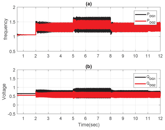 Dynamic response of DG units to unbalanced load changes in feeder and : (a) real power, and (b) reactive power components of DG units.