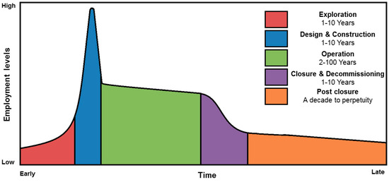 Employment levels fluctuate throughout different phases of the O&G project lifecycle [6,11]. There are limited numbers available during exploration, peak numbers during the construction phase, relatively few during operations and gradually decreasing in the decommissioning phase [23,84], as shown in Figure 1.