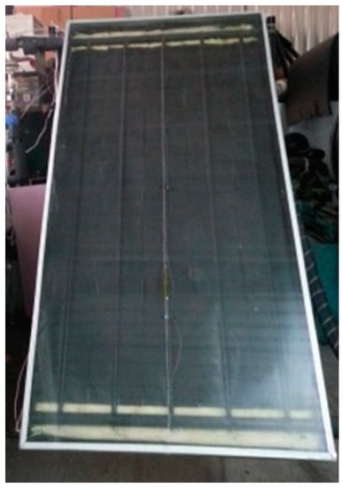 The study involves the manufacture and instrumentation of the solar collector to work in indoor conditions. The sample is shown in Figure 1; this is a glazing collector with 2.00 m2 of gross area Aa and an aspect ratio AR of 40. The 10–90% water–glycol is the working fluid, in which heat capacity is considered variable []. The absorber is comprised of a couple of header tubes d1, and five raised finned tubes d2, all of which of copper and joined by tin–lead solder. The absorber solar absorbance α, is 0.94 and the glazing solar transmittance τ is 0.86 []. The absorbance and transmittance were obtained by normalizing the measured spectral []. A Shimadzu UV-3100 (Shimadzu Corporation, Kyoto, Japan) is used from 300 to 2500 nm, every 2.0 nm with ±0.1% of photometric uncertainty and 1.0% of wavelength uncertainty. Table 1 shows the manufacture characteristics of the sample.