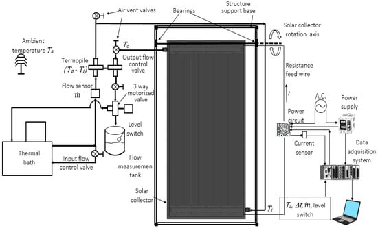 The experimental setup entails that the sample is mounted with a variable angle β at 0–90°, with an uncertainty of ±0.1°. The absorber heating (VI) is homogeneously distributed by means of the electrical heater and remains almost constant over each test. The electrical heater is supplied with a maximum of 2000 W, with an uncertainty of ±5 W. The temperature differences (To − Ti) and (Ti − Ta) were measured using a thermopile type T thermocouple and 32 gauge wires, with an uncertainty of ±0.1 °C. A thermal bath supplied with a 10–90% water–glycol mixture was used as working fluid, with an uncertainty of ±0.01 °C. The mass flow rate was 0.016 kg/s [,]; it was monitored with a turbine flowmeter, with an uncertainty of 3%. It was also verified by weighing the water–glycol mixture, at specified time steps during the experiments. The experimental setup is shown in Figure 4.