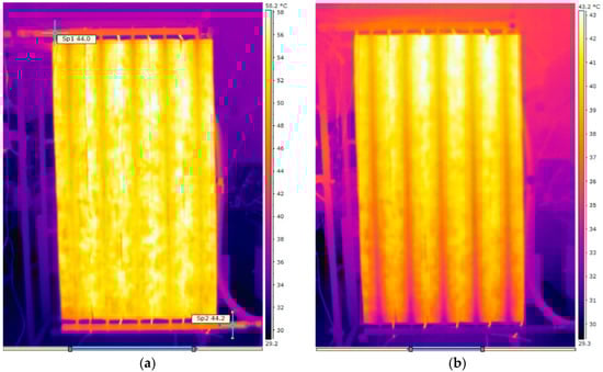 The experimental conditions Tp = Ti and was verified by infrared imaging on the absorber plate. As seen in Figure 5, the field temperature of the absorber plate was as expected, thanks to the PID control losses compensation. Figure 5a shows the Tp = Ti condition, where the standard deviation was only 0.14 °C. Figure 5b shows the case in which , where we can find a conventional temperature profile of the solar collector absorber.