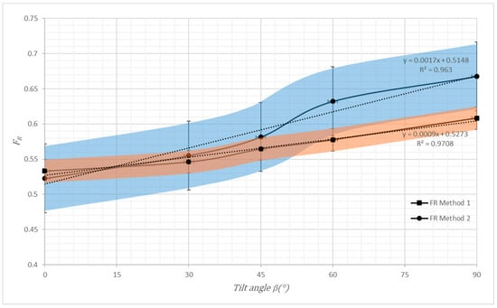 The uncertainty, in terms of RMSE and R2, of each method disclose its performance. Figure 6 shows a similar shape of FR against β for both methods. The FR grew were 0.14 and 0.27 for Methods 1 and 2, respectively. The experimental uncertainties of Methods 2 and 1 were ±0.049 and ±0.016 respectively; this is 306% times greater with Method 2 compared with Method 1. As seen in Figure 6, both shadow gaps of the experimental uncertainty are cross practical. The linearity values are (0.053, 0.9630) and (0.104, 0.9708) for Methods 1 and 2, respectively. The RMSE was considerably higher in Method 2. Method 1 allows for achieving an FR value for every studied value of (Ti − Ta)/G, unlike Method 2, where the FR is just an average value determined from the slope of each efficiency curve. Therefore, the remainder of this paper focuses on Method 1.