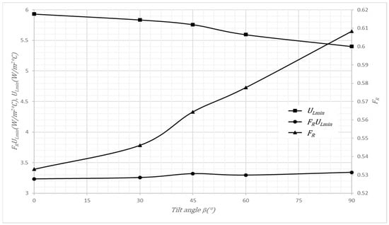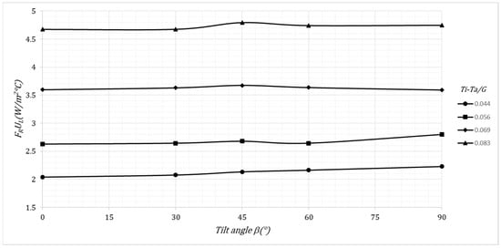 The changes in inclination from horizontal to vertical caused an almost linear increase in FR, (14.5%), which represents a change of 45% due to (Ti − Ta)/G, which caused an average change in FR of 32%. Thus, the effects of changes in tilt angle and (Ti − Ta)/G-value on the a0-factor is considerable, since a0 is directly proportional to FR. The inclination changes do not considerably affect the a1-factor due to the compensation between the increase in FR and the decrease in ULmin when β increases.