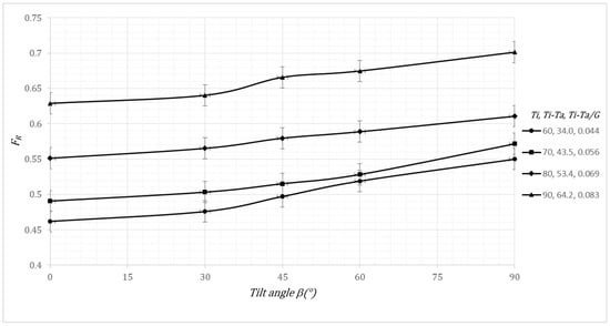 The experiments were conducted highlighting the behavior of the FR and FRULmin as a function of the β and (Ti − Ta)/G. As noted above, the a0-factor is direct proportional to FR and the a1-factor is equal to FRULmin. The experimental campaign comprises five sets of four experiments, each one performed in triplicate. The parametric study was conducted for β as follows: 0°, 30°, 45°, 60°, and 90°. The (Ti − Ta)/G was 0.044, 0.056, 0.069, and 0.083.