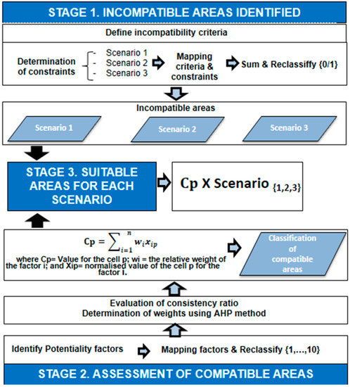 Once the criteria and restrictions had been defined, these were calculated and spatially represented by means of the GIS. Incompatible areas were assigned a value of 0, and compatible areas a value of 1. Afterwards, the resulting cartographies were combined, which resulted in the definition of incompatible areas (value 0) for each scenario.