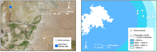 (a) Wind turbines digitized by the author; (b) wind turbines and distance from population centers with >10,000 inhabitants.