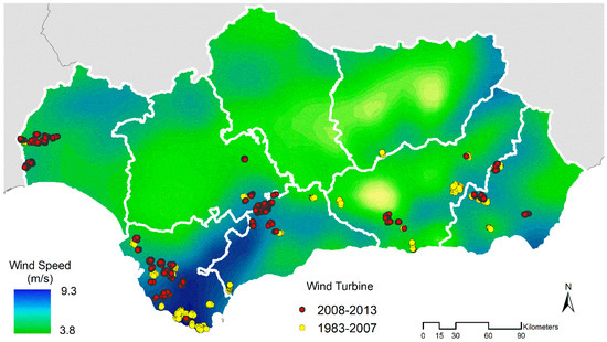 Figure 4 illustrates average wind speed and wind turbines in operation in Andalusia up to 2013. Of the 2060 wind turbines in operation (distributed among 147 wind farms), only those installed after 2008 (a total of 907) were taken into consideration (44% of the total). This is because the installation of wind turbines began in Andalusia a good while ago—the first wind turbine was installed in the municipality of Tarifa (Cádiz), with an average power of 150–300 kV, in 1983—and older wind turbines require the application of different restrictions and criteria.