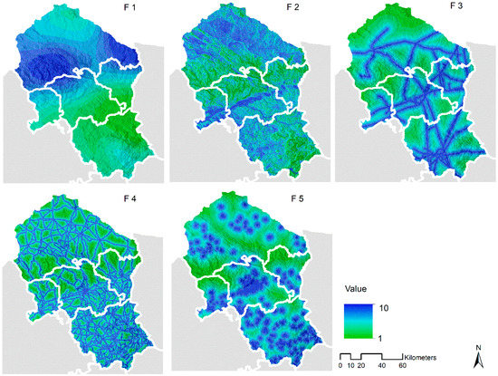 Area maps for each factor. F1: highest wind speed; F2: least slope; F3: proximity to the electric grid; F4: proximity to the road network; F5: proximity to urban nuclei.