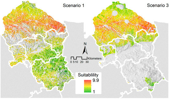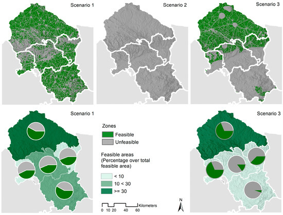 Figure 8 illustrates, for Scenarios 1 and 3, compatible areas classified by potential. In both scenarios, the highest potential value is 9.84. However, while 1268.3 km2 (17% of the feasible territory in the province) has a potential value over 7 in Scenario 1, in Scenario 3 this increases to 1334.1 km2 (26%).