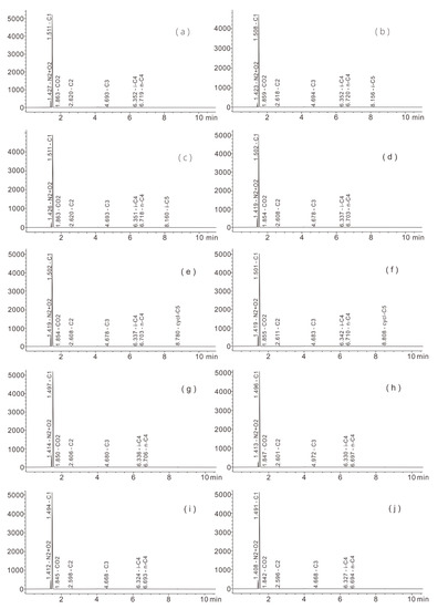 The representative GC curves of the gas samples from China’s first offshore gas hydrate production test in SCS. (a,b) stand for the GC curves of gas extracted from the early depressurization; (c–h) are the curves of the gas samples from the middle production; (i,j) are the samples from the late production. All of the samples exhibit a large C1 peak and other weak peaks, which show that all of the gas samples are predominated by CH4.