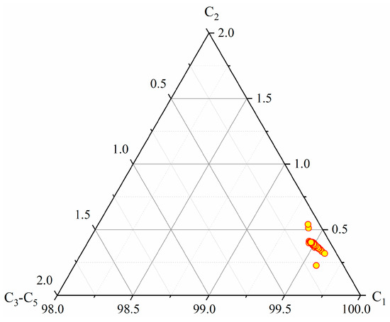 Ternary diagram of hydrocarbons from China’s first offshore gas hydrate production test in SCS. All of the data points fall into the C1 end member, which indicate that methane is the main component of gas.