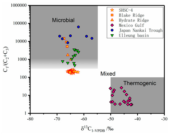 Relationship between C1/(C2 + C3) and δ13C-C1 of hydrocarbon from China’s first offshore gas hydrate production test in SCS (adapted from Whiticar et al. [6]). The data from the Blake Ridge [11], the Hydrate Ridge [7], the Mexico Gulf [12], the Japan Nankai Trough [13], and the Ulleung Basin [14] were plotted for comparison.