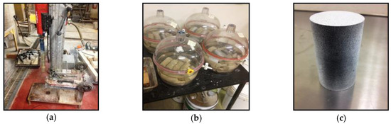(a) Coring machine used to core the sample with 38 mm diameter, (b) Samples saturated with different fluids under vacuum in saturation chambers, and (c) Shaped and painted sample soon before the strength tests.