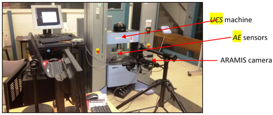 Experimental setup used for the mechanical testing, indicating the UCS machine, Acoustic emission system and ARAMIS camera.