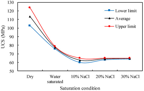 In relation to the influence of saline water or brine in the pore fluid, some salinity in the pore fluid causes the siltstone to be weakened. For example, according to Figure 3, the presence of 10% NaCl in the pore water causes the siltstone’s compressive strength to be further reduced by around 19% compared to the water-saturated samples. However, it is noticeable that NaCl ions contains in the solution does not change the UCS significantly, because the reduction percentage is comparatively less compared to ‘dry-to-water saturated’ stage. Further increment of the brine percentage in the pore fluid beyond 10% NaCl causes the strength of the siltstone to be slightly increased. According to the results, the average UCS value increases from 62.5 to 64 MPa, when the NaCl concentration increases from 10% to 20%. The same trend can be observed up to 30% concentration of NaCl, in which the UCS value increases from 64 to 64.5 MPa with increasing NaCl concentration from 20% to 30%. A similar influence of brine saturation on sandstone has been reported by Rathnaweera, Ranjith and Perera [28]. The reduction of rock strength with NaCl in the pore fluid possibly occurs for two main reasons: (1) the adsorption of NaCl molecules into the rock matrix causes the surface energy to be reduced, reducing the fracturing strength [35] and, (2) NaCl creates chemical corrosion of rock grain [36,37,38] and its cementation phase, which eventually reduce the rock strength [39]. However, there is also a positive influence of NaCl, as a high concentration of NaCl in the pore fluid causes NaCl crystals to be precipitated in the rock mass pore space [28,40], and these NaCl crystals create additional load-bearing surfaces in the rock mass, increasing its strength. Overall, it can be concluded that, the competitive influence of chemical corrosion, surface energy reduction and NaCl crystallization determines the influence of pore fluid NaCl concentration on the overall rock mass strength characteristics. According to Figure 3, at low order NaCl concentrations (i.e., ~10% NaCl by weight) the influences of chemical corrosion and surface energy reduction are dominant, whereas at high order NaCl concentrations (i.e., >20% NaCl by weight), NaCl crystallization effect becomes dominant, resulting in a slight strength re-gain.