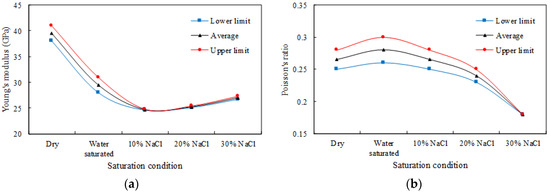The main aim of this section is to evaluate the effect of pore fluid saturation on the fracability of siltstone, as it is most important for hydraulic fracturing. Figure 4a shows how the Young’s modulus of the tested siltstone varies with pore fluid saturation. Young’s modulus is widely used in the field to identify the brittleness of reservoir rocks [30,33]. It has been found that rocks with greater Young’s modulus have higher brittleness, as it represents lower expansibility of the sample under loading. Apart from the Young’s modulus, Poisson’s ratio also provides useful information on the expansibility of the rock matrix, as it is an indicator of the lateral-to-vertical strain ratio. In contrast to Young’s modulus, the greater Poisson’s ratio of a rock mass represents lower brittleness or less fracability. Such behaviour in unconventional reservoirs is less-advantageous for an effective hydraulic fracturing process, as the expansion of the rock matrix under hydraulic loading may heal existing fractures and reduce the ability to create new fractures [2].