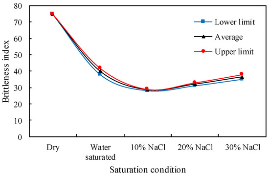 If the overall trends of Young’s modulus and BI with increasing NaCl concentration are considered, it can be seen that both Young’s modulus and the BI are increasing with the salinity level from 10% to 30%, which in turn indicate the increment of brittleness characteristics of the siltstone (see Figure 4a and Figure 5). Even though both trends seem similar, above observations confirm the fact that evaluation of brittleness using a single elastic parameter such as Young’s modulus is inaccurate and unreliable to attain decisive conclusions, because the actual influence of the salinity percentage of pore fluid on rock fracability is often over/under estimated by those single parameters. This also points out the inaccuracy of some conclusions drawn in the literature on the effect of salinity on the fracability of reservoir rocks [28,40]. In addition, according to the BI evaluation, water saturation has a critically high influence on the fracability of the siltstone, causing it to be significantly reduced [47]. This is an important aspect of the hydraulic fracturing process, particularly when using water-based fracturing fluids, because the use of water-based fracturing fluid may not be a feasible option for some unconventional reservoir hydraulic fracturing, as it produces reduced fracability in the rock formation.