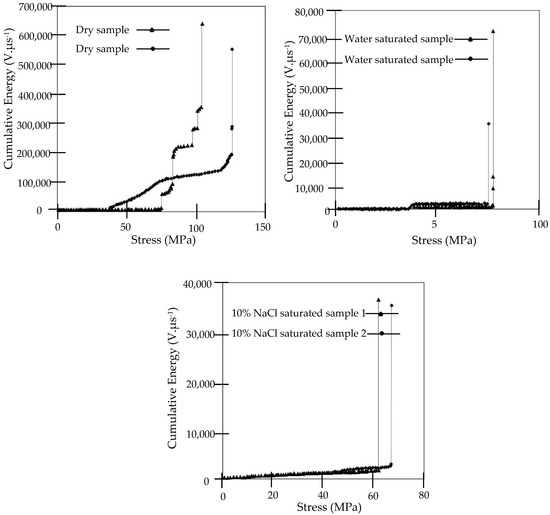 The fracture propagation process can be clearly identified by observing the AE energy released during the load application, which is shown in Figure 6. In AE counts, the stress at which the cumulative energy suddenly increases indicates the crack initiation point. A clear, gradual crack propagation pattern can be seen in the dry siltstone samples, exhibiting a greater ability to control the fracturing process in dry siltstone. The crack initiation stress for dry condition is about 33 and 27 MPa for the two dry samples, respectively. However, water saturation weakens the fracturing ability of the siltstone sample, in which a sudden breakage is clearly visible upon load application. The fracture initiation stress is much greater than that for the dry sample because the saturated samples have been completely failed without any initial stable fracture propagation, due to the softening effect of water saturation. The other important observation is the total cumulative energy release in dry samples is much greater than that in the water-saturated samples (nearly 10 times greater than for the water- and brine-saturated conditions). This proves the reduced surface energy in saturated samples compared to dry samples and therefore the lower fracturing ability in siltstone after saturation [48].