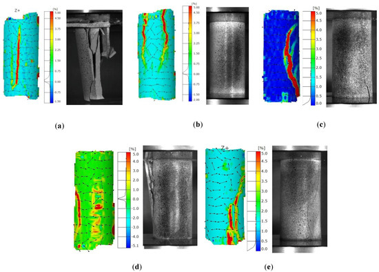 ARAMIS images of varyingly saturated siltstone samples; (a) dry, (b) water-saturated, (c) 10% NaCl-saturated, (d) 20% NaCl-saturated, and (e) 30% NaCl-saturated. Note that the colour maps indicate the sample deformation in both axial and lateral direction soon before failure.
