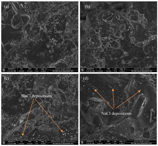 SEM test results of (a) water-saturated (b) 10% NaCl-saturated (c) 20% NaCl brine-saturated and (d) 30% NaCl-saturated specimens. Note that the higher order concentrations of NaCl cause NaCl precipitation in siltstone pores, resulting in a slight strength increment.