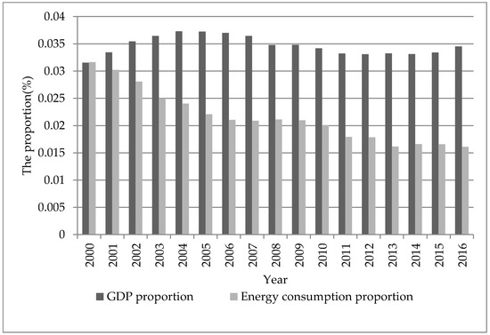 Figure 2, Beijing’s gross domestic product (GDP) proportion in China changed less from 2000 to 2016, whereas energy consumption proportion decreased more. Thus, compared with other cities in China, Beijing managed the energy consumption without discouraging economic growth. Research on Beijing is of great significance to the whole country.