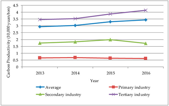 Figure 4), the increase was not prominent, and the annual growth rate was about 4.89%. The carbon productivity of the primary industry was the lowest and its change was tiny over the four years, and the carbon productivity declined slowly after 2014. The carbon productivity of secondary industry was far below the average level, and formed a trend of gradual improvement, and then a sharp decline, with carbon productivity falling 13.38% in 2015–2016. The carbon productivity of tertiary industry was outstanding; it was not only much higher than the primary, secondary, and average values, but also increased steadily from 2013 to 2016, with an average annual growth rate of 6.21%.