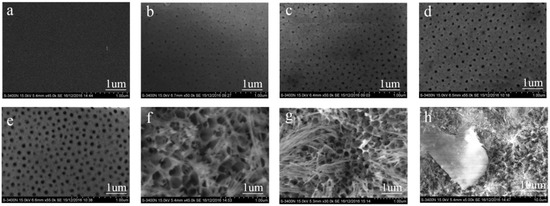 Figure 1a shows the aluminum plates that were just polished, being smooth and flat. When the magnitude of current was increased to 1 A (Figure 1b), it was observed that the nanoporous surfaces were arranged in a dense order on the surface template and shape of the rules of the hexagonal structure, exactly like “honeycomb”. The current was increased to 2 A, 3 A, and 4 A (Figure 1c–e), respectivelyl. The number of nanoporous did not obviously change, but the size increased with the current. The average nanopore size was 15–70 nm. With the magnitude of current increased to 5 A (Figure 1f), the nanoporous diameter continues to increase, close to 110 nm, another change is that the linear structure appears on the surface, in other words, the surface roughness had increased, while the surface structure had a tendency to be destroyed. Figure 1g showed the SEM images of AAO with current magnitude of 6 A. It could be observed that the nanoporous was fully covered with linear structure, and the porous size were difficult to determine, but it was certain that the surface roughness was further increased; in addition, some nanoporous had been damaged, but still had nanostructures. However, as the current magnitude was increased to 7 A (Figure 1h), some parts of the surface of the nanostructures were completely destroyed, and the polishing layer appeared. In other words, the surface roughness evolved toward the polishing sheet. In conclusion, both the size of nanoporous and the surface roughness increase as the current increases until the surface structure is destroyed.