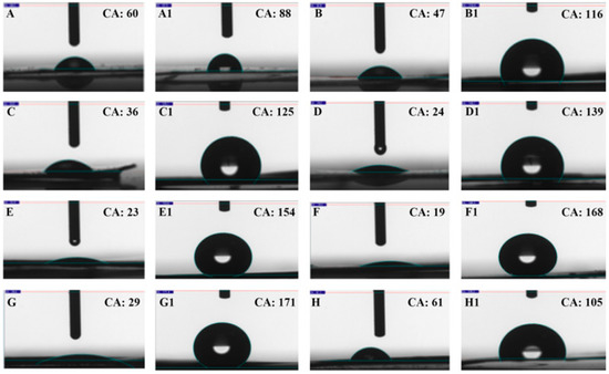 The contact angles of water on the prepared plates with different magnitude of current: (A) 0 A, (A1) modification by lauric acid on (A); (B) 1 A, (B1) modification by lauric acid on (B); (C) 2 A, (C1) modification by lauric acid on (C); (D) 3 A, (D1) modification by lauric acid on (D); (E) 4 A, (E1) modification by lauric acid on (E); (F) 5 A, (F1) modification by lauric acid on (F); (G) 6 A, (G1) modification by lauric acid on (G); (H) 7 A, (H1) modification by lauric acid on (H).