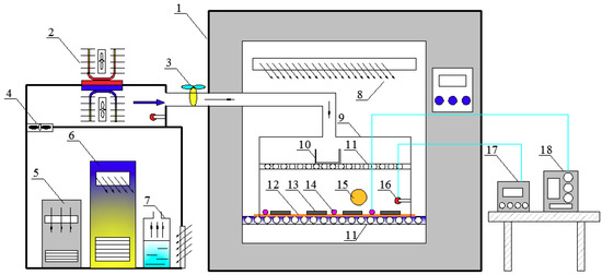 Schematic of the proposed system. 1—low temperature humidity chamber; 2—semiconductor refrigerator; 3—air valve; 4—draught fan; 5—dehumidifier; 6—mobile air conditioning; 7—ultrasonic humidifier; 8—air outlet; 9—closed box; 10—condensate container; 11—diversion grid; 12—copper plate; 13—Al plates; 14—thermocouples; 15—wind speed probes; 16—temperature/humidity probes; 17—multichannel temperature/humidity detection system; 18—multichannel temperature monitor.