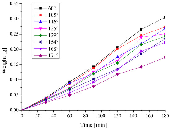 Figure 8. Variations of frost weight with different contact angles. - Figure 9 shows the average frosting rate with a different contact angle. As the aluminum plates contact angle increases, the frost weight growth rate is decreased sharply. The frosting rate correspond to the aluminum plate with the contact angle of 60° is 0.33 [g/(min∙m2)], and correspond to the aluminum plate with the contact angle of 171° is 0.19 [g/(min∙m2)].