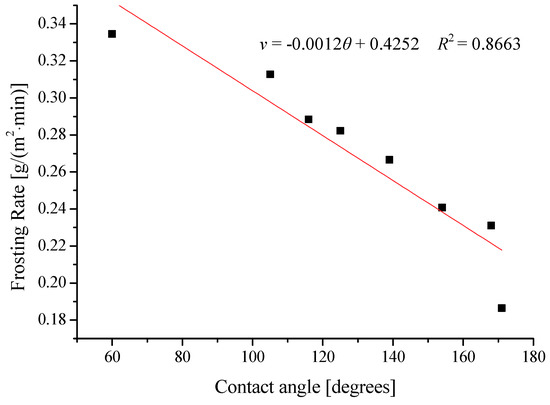 - The frosting rate of the aluminum plate with the contact angle of 60° is 0.33 [g/(min∙m2)], and the aluminum plate with the contact angle of 171° is 0.19 [g/(min∙m2)].