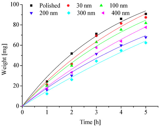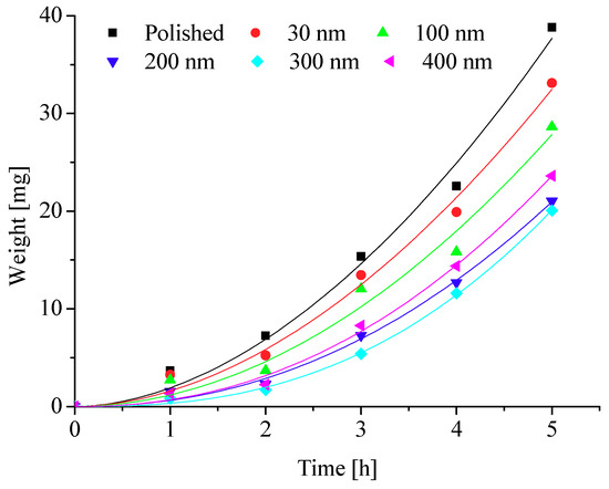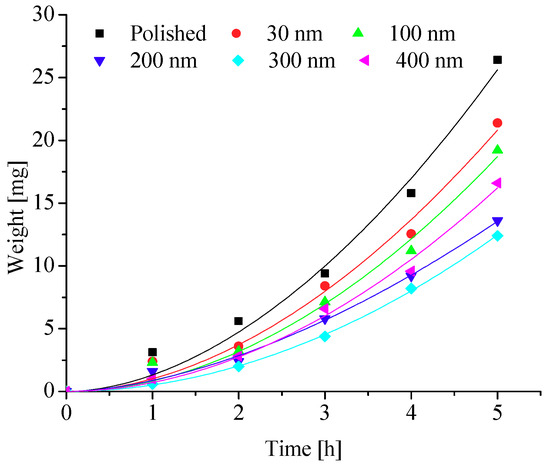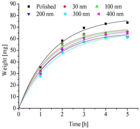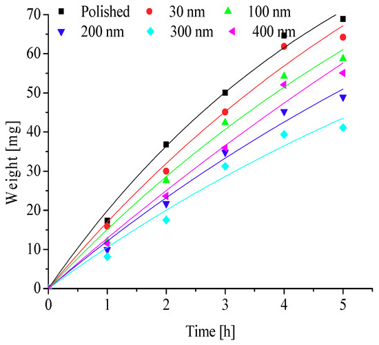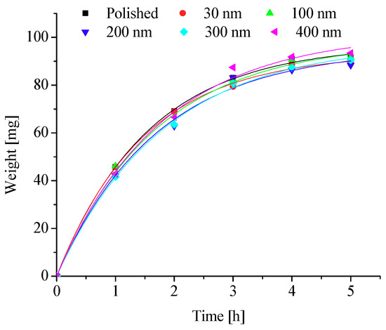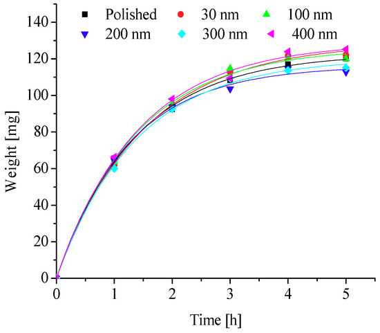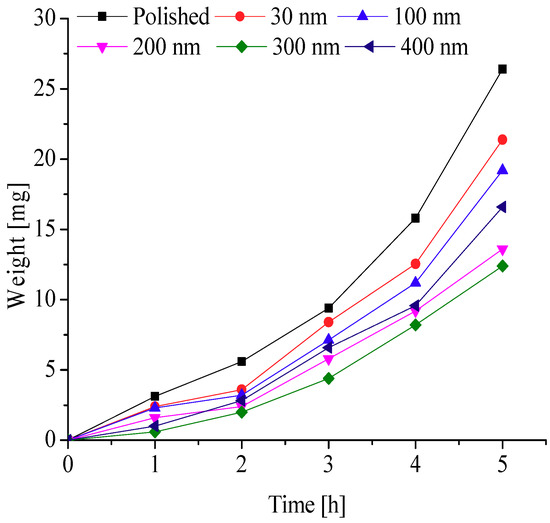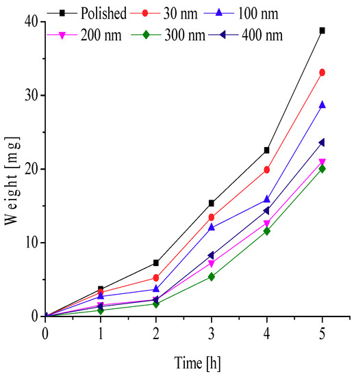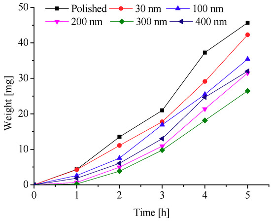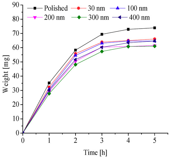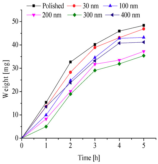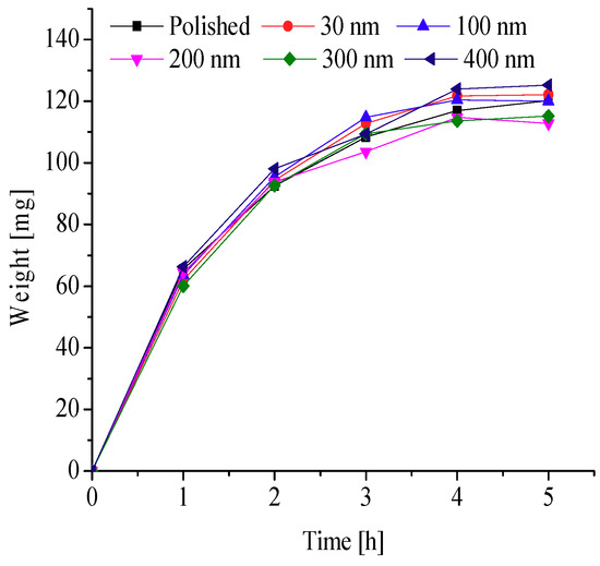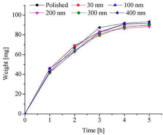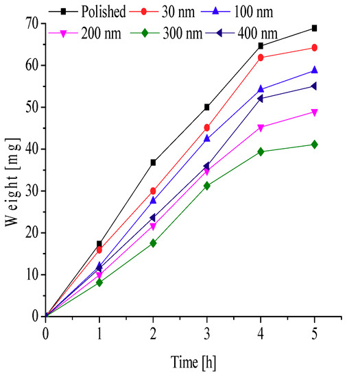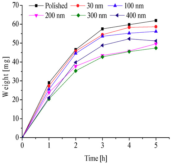 To further explore the effects of different nanopore diameters on surface frosting properties, nanoporous aluminum plates with 30 nm, 100 nm, 200 nm, 300 nm, and 400 nm diameter were prepared by anodic oxide and then undergo expand aperture processing (It should be mentioned that the aperture-expanding process was completed by another company), the polished aluminum plates was also be prepared in order to compare. Keeping the same test equipment and test methods, the test conditions are as followings: aluminum surface temperature is about −5 °C, −10 °C, −15 °C, −20 °C and −25 °C, ambient relative humidity is about 60% and 90%, and the environment ambient temperature is always keeping about −5 °C, which can invest the frosting properties of different nanoporous aluminum plates under different conditions. The testing time are 1 h, 2 h, 3 h, 4 h and 5 h, respectively, then the difference in weight comparing with the initial aluminum plate can be calculated and the frosting properties can be analyzed. The results of the testing can be presented and discussed as follows.