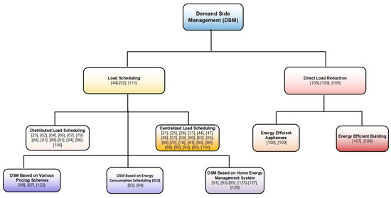 Direct load reduction can be further classified into two types: by the use of energy efficient appliances and by the use of energy efficient buildings [103]. In the same way, load scheduling is also divided into two types: centralized and distributed scheduling identifies, as shown in Table 6. A flow diagram of DSM classification along with relevant references is given in Figure 4.