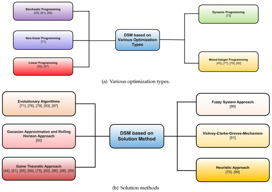 There are plenty of research articles available in the literature with the aim of minimizing costs, consumers’ electricity bills, and the peak to average power ratio, etc, by employing efficient DSM schemes. These research articles along with the objectives achieved and advantages associated with each article are summarized in Table 7. To achieve these objectives, authors have utilized different optimization approaches. The various optimization approaches employed in DSM schemes along with the relevant references are shown in Figure 5.