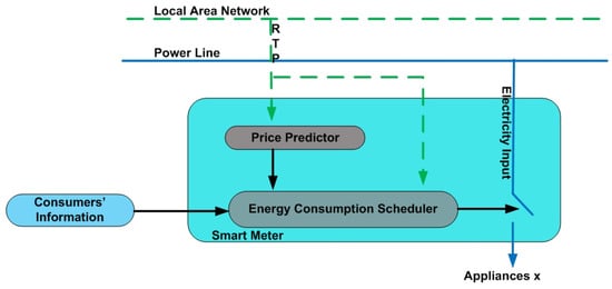 DSM can be carried out through energy consumption scheduling (ECS). Various home energy management technique based on ECS are available in the literature. An optimization based residential load control scheme based on simple linear programming (LP) using the concepts of ECS was proposed in [82,83]. The authors proposed a mathematical model to represent the residential load control. The proposed scheme works on RTP which requires a price predictor. The price predictor collects information about the prices from yesterday, the day before yesterday, and for the same day in the previous week, and on the basis of this information, it predicts the price per kWh in real-time. The price predictor and ECS device of [82] are shown in Figure 6. The scheme in [82,83] significantly reduces the peak load which results in the reduction of the PAPR and the demanded load for different scenarios.