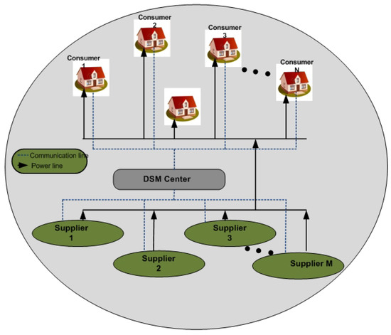 Game theory is one of the mathematical tools used in the literature to model different DSM schemes that is valuable both for consumers as well as for suppliers. In [61,81,82,140,141,142,143], the authors introduced autonomous DSM schemes based on game theory. In the first one of these articles, the authors proposed a scheme in which each consumer schedules his/her own energy usage in a time slot with a low price by participating in the game, thus reducing his/her electricity bills. The energy cost is minimized by achieving the Nash equilibrium point. The PAPR is reduced by using the distributed DSM in [61]. The formulation is based on the non-cooperative game theory, where the consumers act as players and the utility companies as strategies. Similarly, the authors in [140,141,142], used the multiple leader multiple follower Stackelberg game to maximize the profits of the micro-grid. In [81], the authors considered a scenario with multiple suppliers connected to a central DSM center as well as with the consumers through the communication link and power line, as shown in Figure 7.