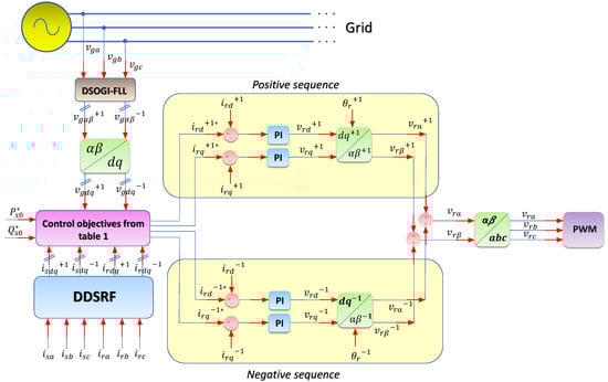 Only the rotor components can be controlled using the classic vector control, thus it is solely possible to control two power components from Equation (26), usually the average active and reactive power ( and ). By giving rise to the possibility of also controlling the rotor current components, two other parameters can be controlled as well. This technique was used for another situation in [28]. From then on, four main objectives can be drawn for the use of the synchronous compensator with unbalanced voltages: